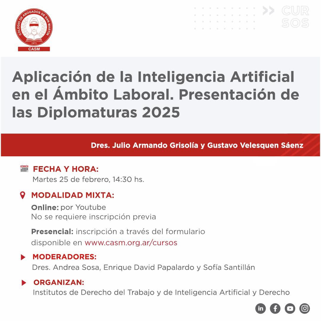 Tema: Aplicación de la inteligencia artificial en el ámbito laboral. Presentación de las Diplomaturas en Derecho Individual y Colectivo del Trabajo y la Seguridad Social 2025, dirigidas por el Dr. Grisolia, en el CASM