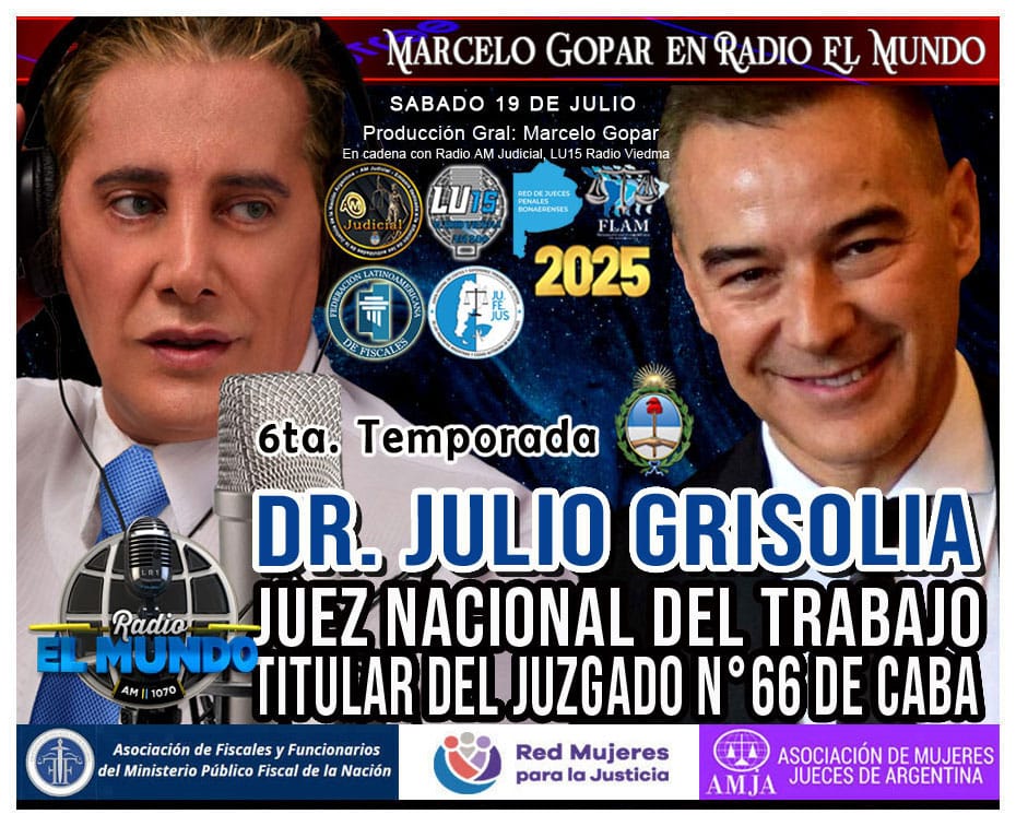 ENTREVISTA a JULIO A. GRISOLIA en el programa «MARCELO GOPAR en RADIO EL MUNDO» (19 de julio 2025). Su mirada sobre la realidad actual, la justicia, los jueces, el mundo del trabajo, el fuero laboral. Escuchala completa acá
