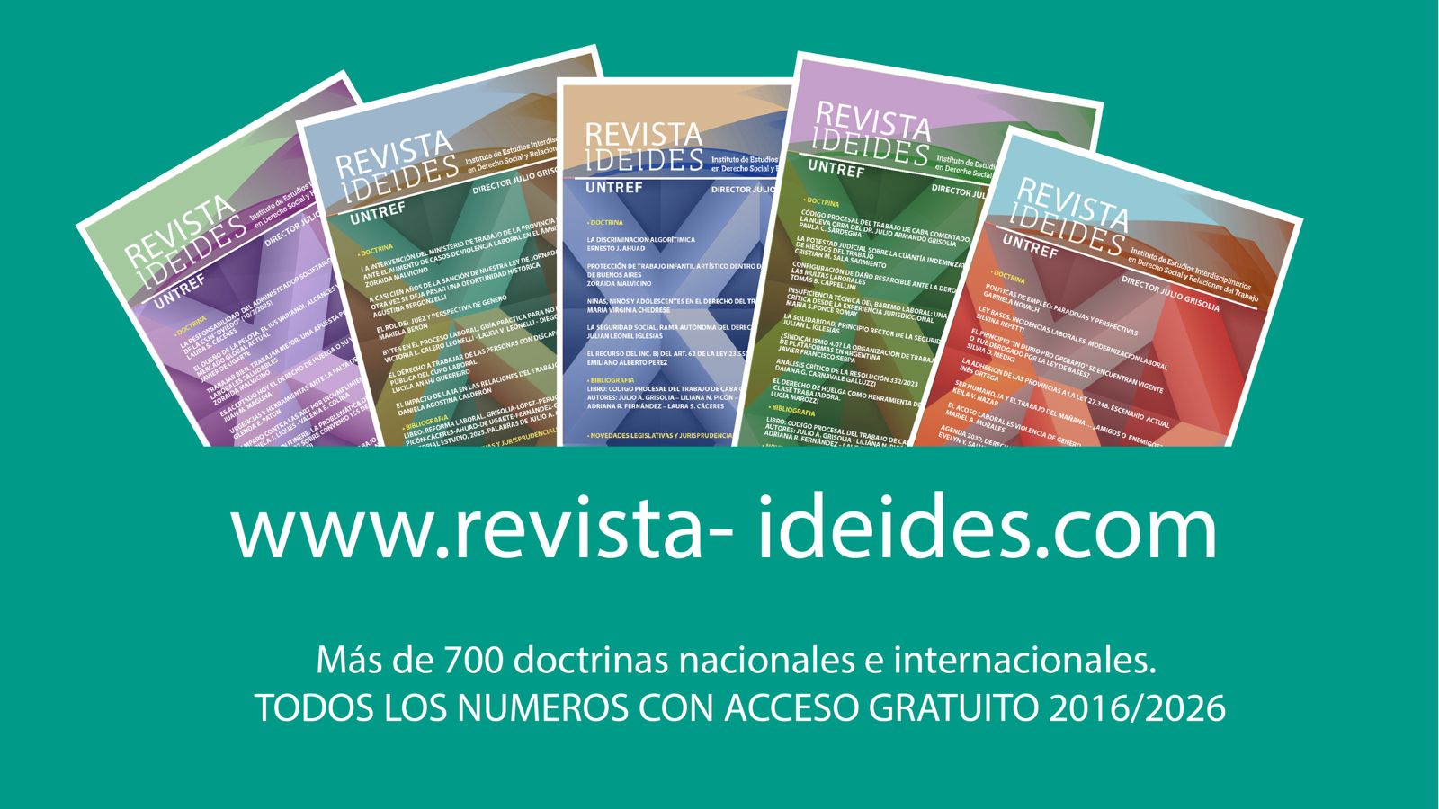 REVISTA IDEIDES es la revista electrónica mensual del Instituto de Estudios Interdisciplinarios en Derecho Social y Relaciones del Trabajo (IDEIDES) de la Universidad Nacional de Tres de Febrero (UNTREF) que iniciara sus actividades en 2006 (www.ideides.com). Creada en 2016 por el Dr. Julio A. Grisolia, cuenta con más de 700 doctrinas publicadas y ya ha superado las 115revistas.